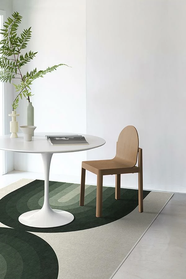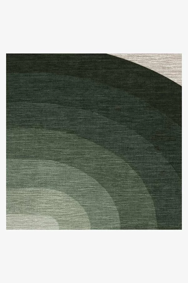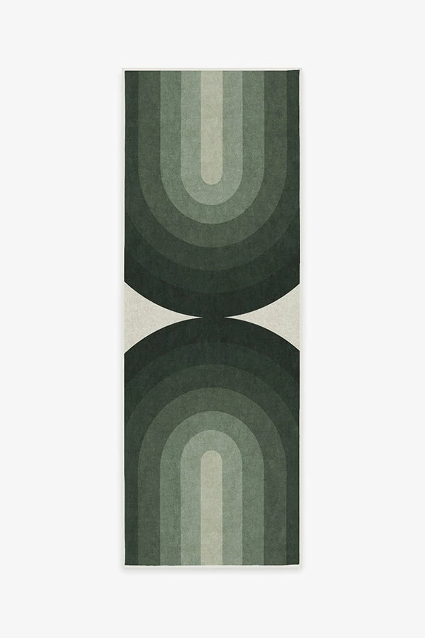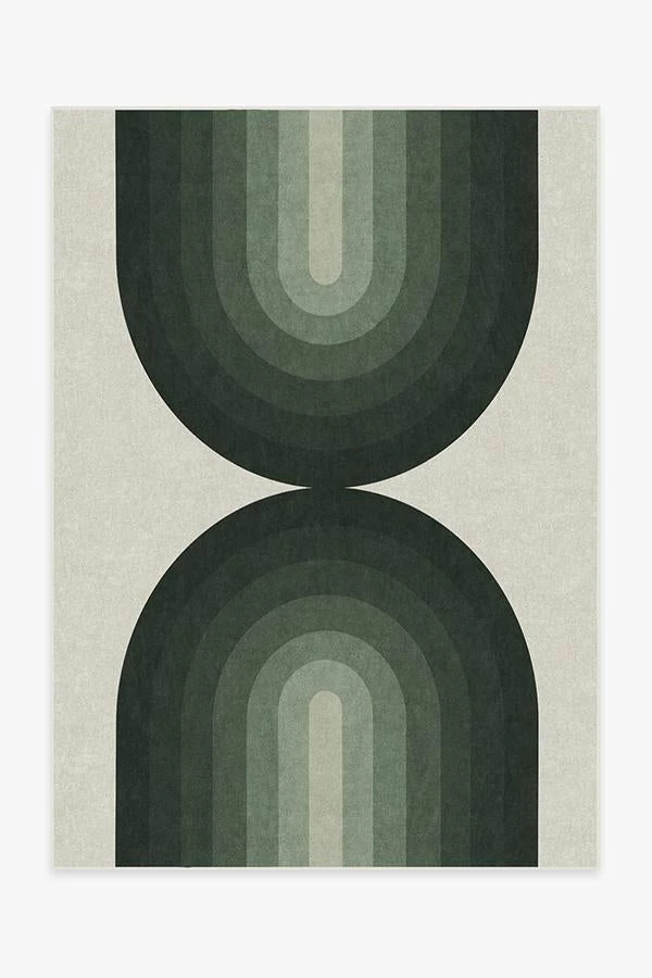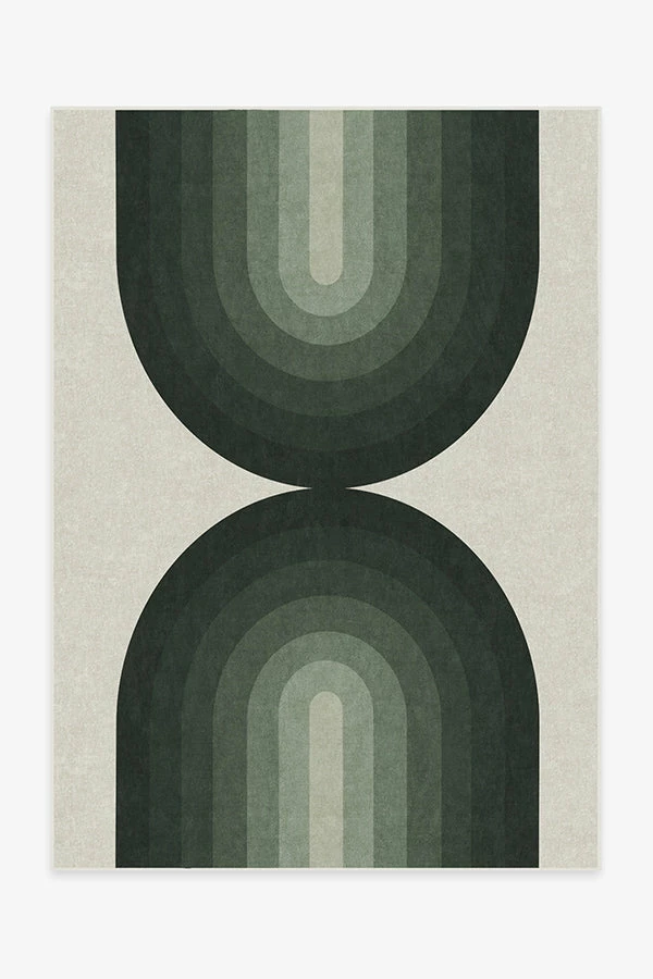 Alluring and abstract. Taking inspiration from Bahaus artist Josef Albers, this modern rug design features mirrored arches in shades ranging from dark hunter green to light sage on an off white backdrop. Water-resistant, stain-resistant, and machine washable.