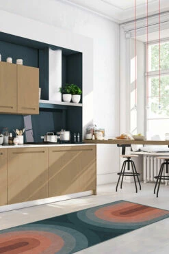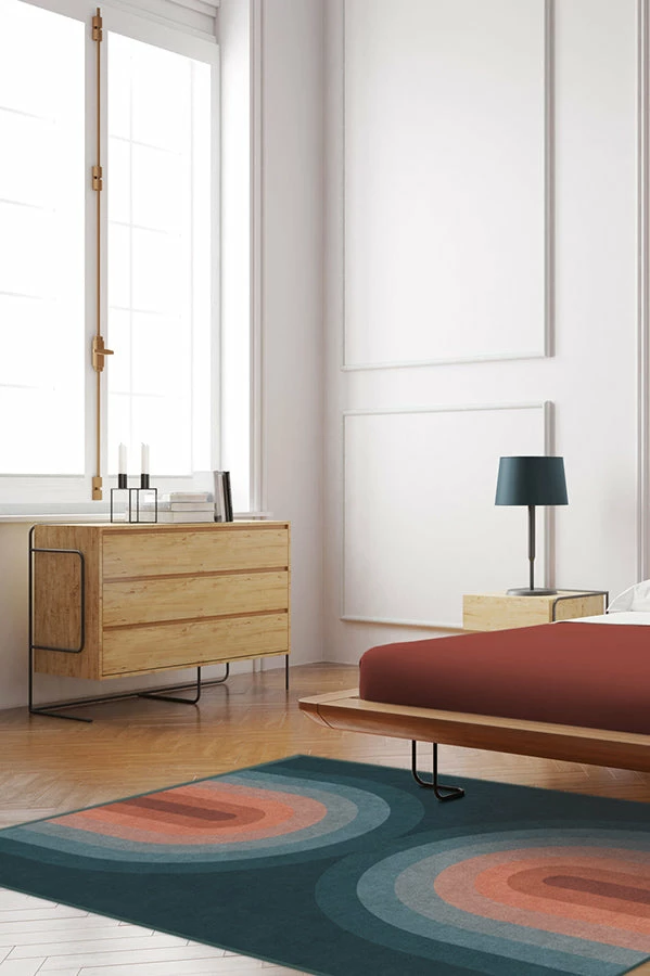 Our Absida Teal Rug takes inspiration from Bauhaus artist Josef Albers and plays up the interaction between color and composition. This modern abstract rug design features mirrored arches tinted in a deep teal background that graduates to copper and rosewood, creating a glowing effect.