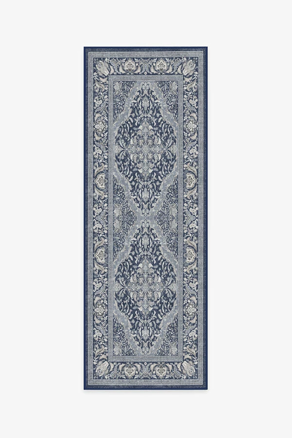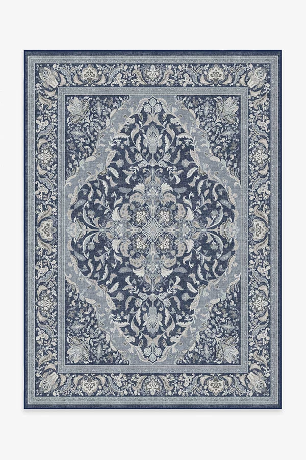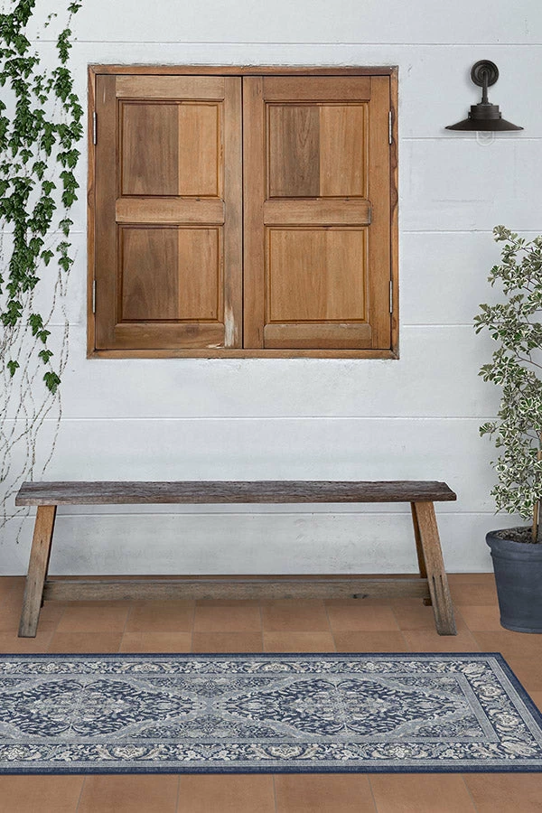 Reminiscent of a botanical garden. Our Allura Soft Navy Outdoor Rug features a lively bouquet center and intricate floral corners, complemented by a lovely vine border, in shades of dark and light blue with grey. Made from our extra-durable, machine-washable material that’s perfect for both outdoor and indoor use, especially high-traffic areas and those exposed to the elements.