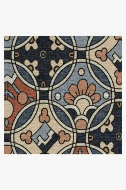 An eye-catching piece. Our Anna Sui Sullivan Navy Rug features a lively pattern reminiscent of stained glass window panes in hues of navy, cayenne, red, and cream set atop a navy background. Made from our water-resistant, stain-resistant, and machine-washable low-pile Chenille material.