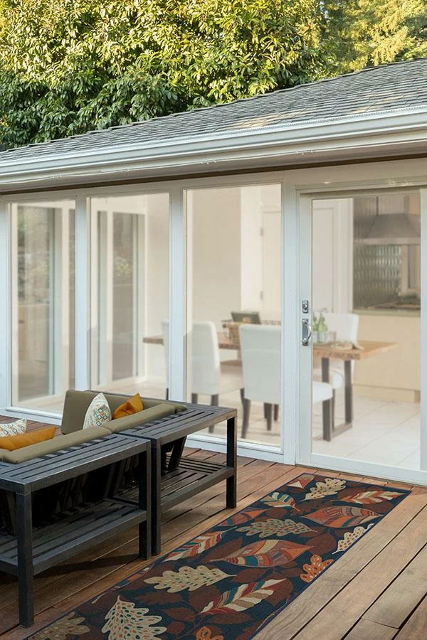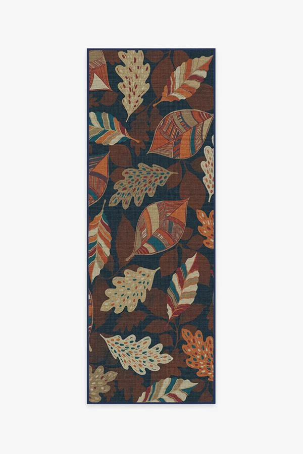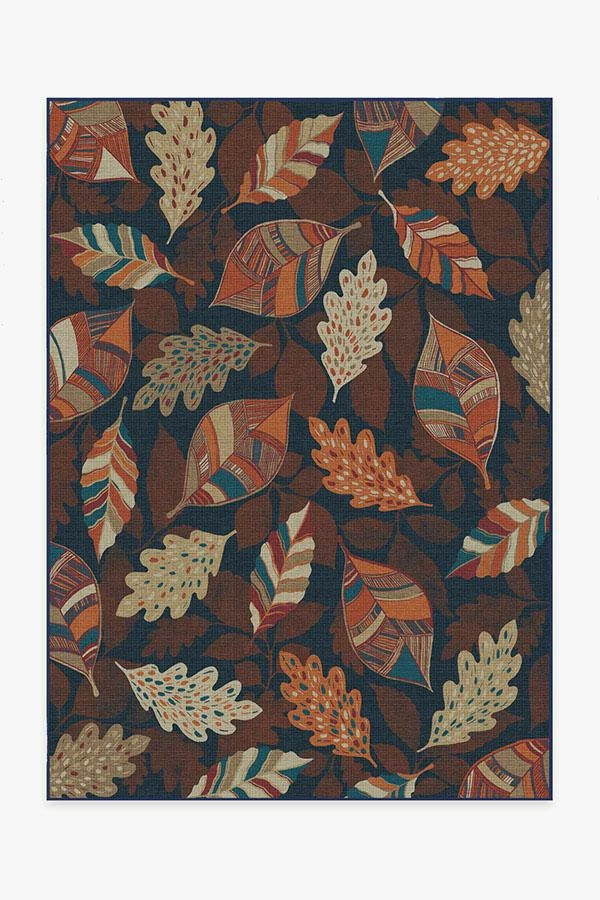 A classic nature-inspired autumn rug design. This artistic illustration of fallen leaves features classic seasonal tones, including bright orange and warm brick red set against a cool and calming background of deep midnight blue. Made with extra-durable, machine-washable material that’s perfect for both outdoor and indoor use, especially high-traffic areas and those exposed to the elements.