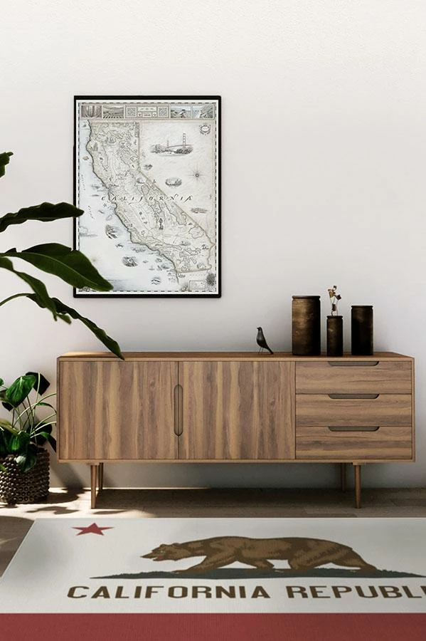 Show your Cali Love all year round with the California Red Rug. This design features Monarch, the iconic California Bear in rich tones of chocolate brown and beige walking on a patch of sage green above a strong solid bar of rich tomato red.