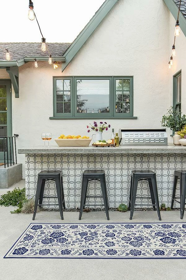 Elegant and bold. This outdoor rug is inspired by a spring garden with vibrant delft blue flowers on an off-white background. Its extra-durable, machine-washable material makes it easy to clean and stands up well against dirt, dust, and heavy foot traffic indoor or outdoor.