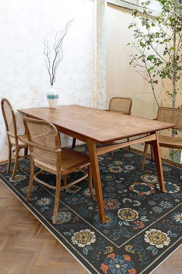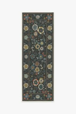 Fun and floral. This colorful outdoor rug features spring flowers in shades of teal, mustard yellow, and terracotta on a black background. Its durable, machine-washable material is perfect for high-traffic areas both outdoors and indoors.