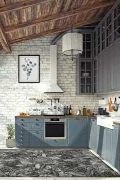 Our Echeveria Black Rug is a dark and dreamy take on classic florals. Rendered in black, grey, and white, this modern floral rug features a large, rose-shaped succulent at the center, surrounded by thorns, leaves, and smaller echeverias.