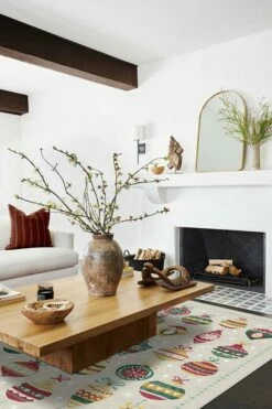 Relive your childhood yuletide memories with our Festive Garland Holiday Shortbread Rug. The colorful design features retro-style ornaments bordered by stars and ribbons in pistachio green, teal blue, polenta yellow, and raspberry red on a background of light cream. Made from our water-resistant, stain-resistant, and machine-washable low-pile Chenille material.