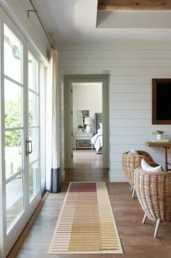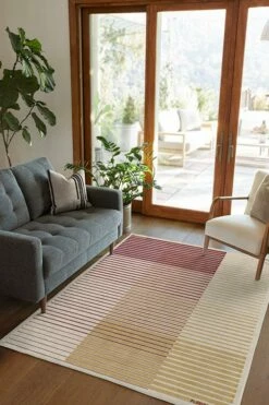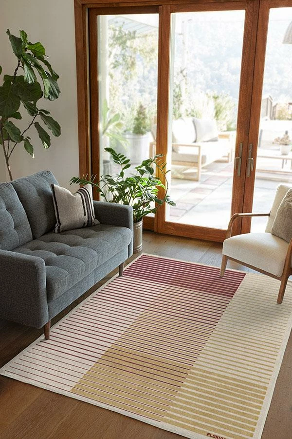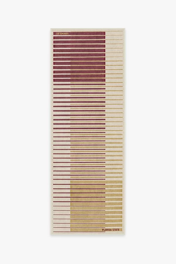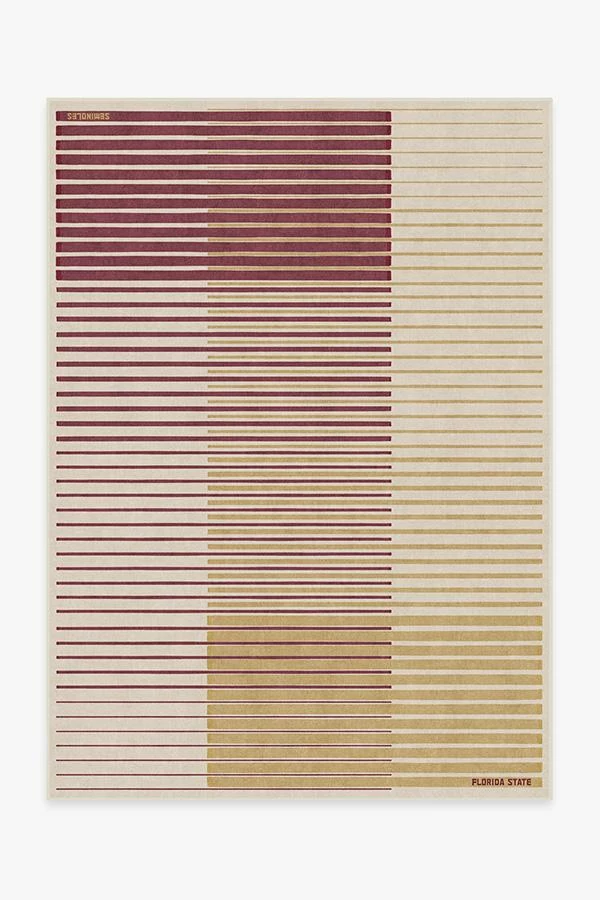Subtle yet unmistakably Seminoles inspired. This gradient striped rug shows off Florida State University’s colors, garnet and gold, on a dark ivory background, with “Florida State” and “Seminoles” written on the sides. Water-resistant, stain-resistant, and machine-washable.
