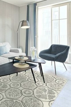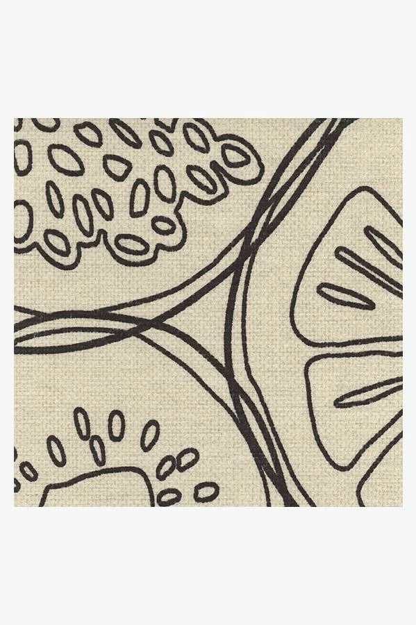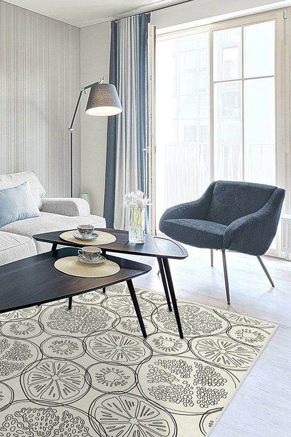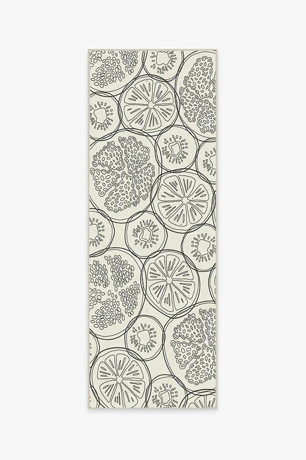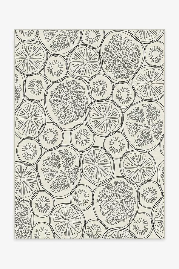 Fruit-Punch Blackberry Rug puts a contemporary twist on tropical design. Made to look like thin slices of fruit floating in a punch bowl, this linework motif blends high-contrast hues of grey and cream to create a look that’s minimalistic and sophisticated.