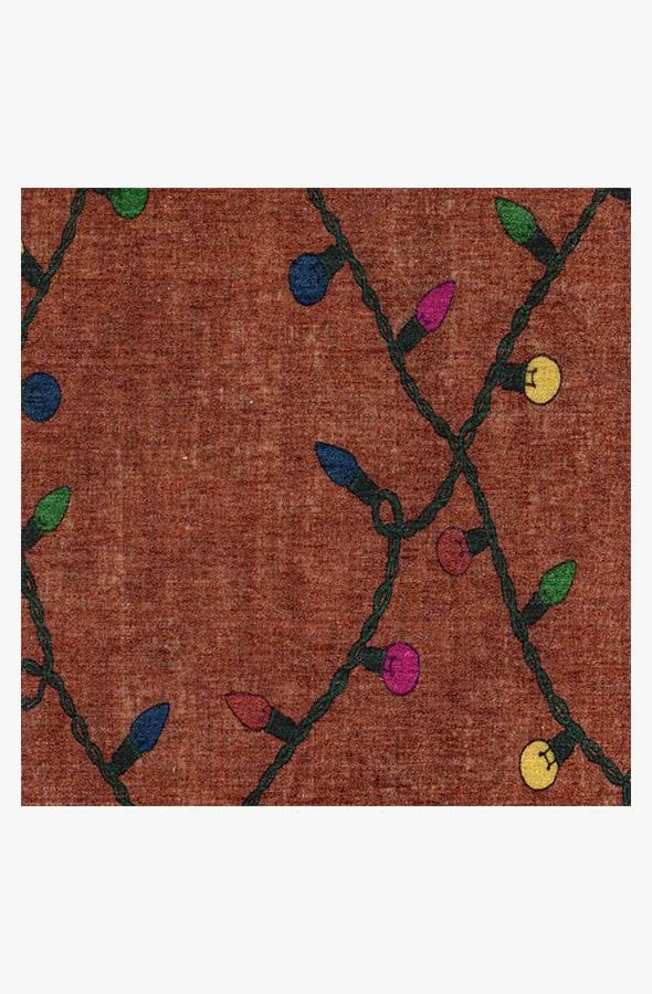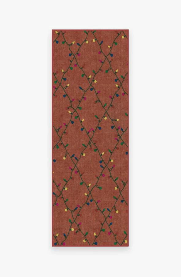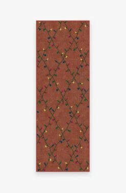 Festive and fun. Our Holiday Lights Red Rug features a diamond pattern of vintage-style string lights in jolly hues of evergreen and tomato red on a rich field of holiday red. Made from our water-resistant, stain-resistant, and machine-washable low-pile Chenille material.
