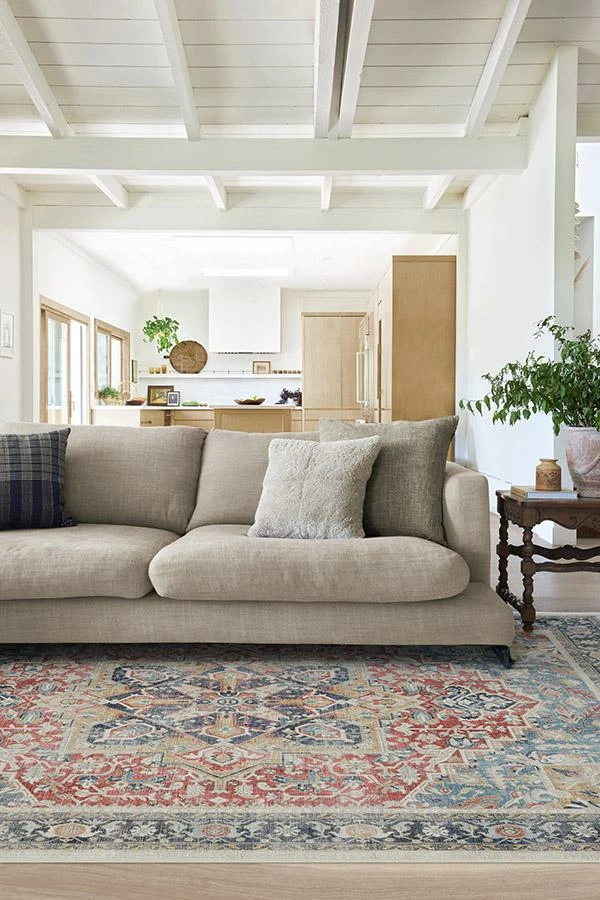 A Persian design with a distressed look. Inspired by traditional Heriz rugs, this design features a large medallion with an ornate border in rich shades of vintage red, navy, and gold. Water-resistant, stain-resistant, and machine-washable.