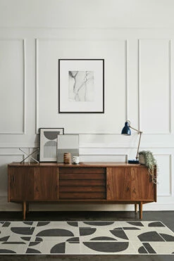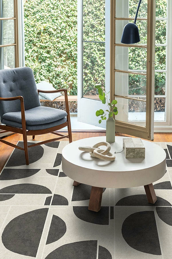 Modern and sophisticated. Inspired by the lunar cycle, our Nina Takesh Lune Charcoal Rug has a design of circular shapes and lines in dark grey and off-white on an ivory background. Made from our water-resistant, stain-resistant, and machine-washable low-pile Chenille material.