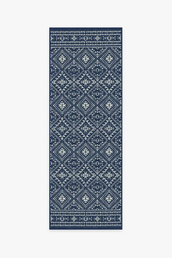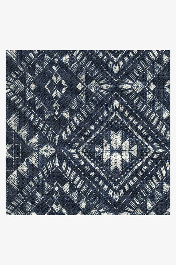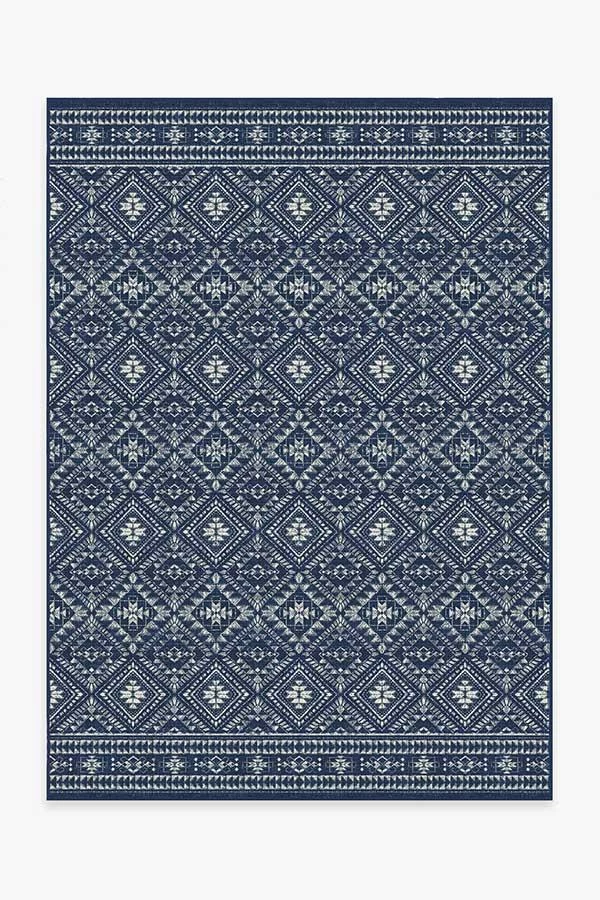 A highly detailed design. Our Nomada Navy Rug features an intricate geometric pattern of diamonds with inner motifs bordered on two sides in navy blue and off-white. The extra-durable, machine-washable material is perfect for both outdoor and indoor use, especially high-traffic areas and those exposed to the elements.