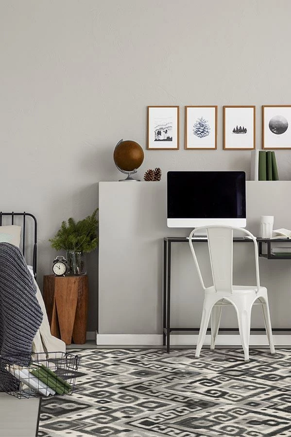 This Orissa Grey rug features a motif inspired by traditional Indian kilim designs in neutral shades of greys and cream.