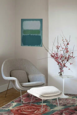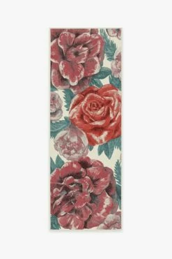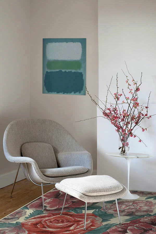 Our Primrose Quartz rug showcases a hand painted vintage-style floral motif in a palette of reds and teal blue on a light background.