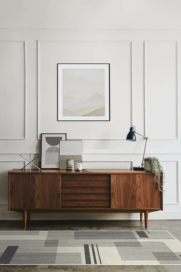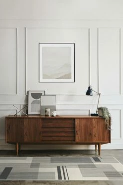 Like a piece of modern art for your floor! Inspired by the works of Bauhaus artist Josef Albers, this abstract rug features overlapping lines that form squares and rectangles in grey on a light cream backdrop. Water-resistant, stain-resistant, and machine washable.
