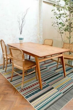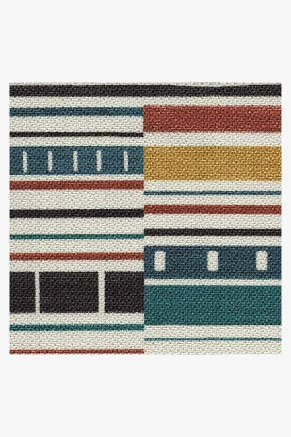 A maximalist stripe that makes a statement. Deep red, mustard yellow, teal, black, and cream blend together beautifully on this outdoor rug. The durable, textured material is machine-washable and designed to hold up against dirt, dust, and heavy foot traffic whether indoor or outdoor.