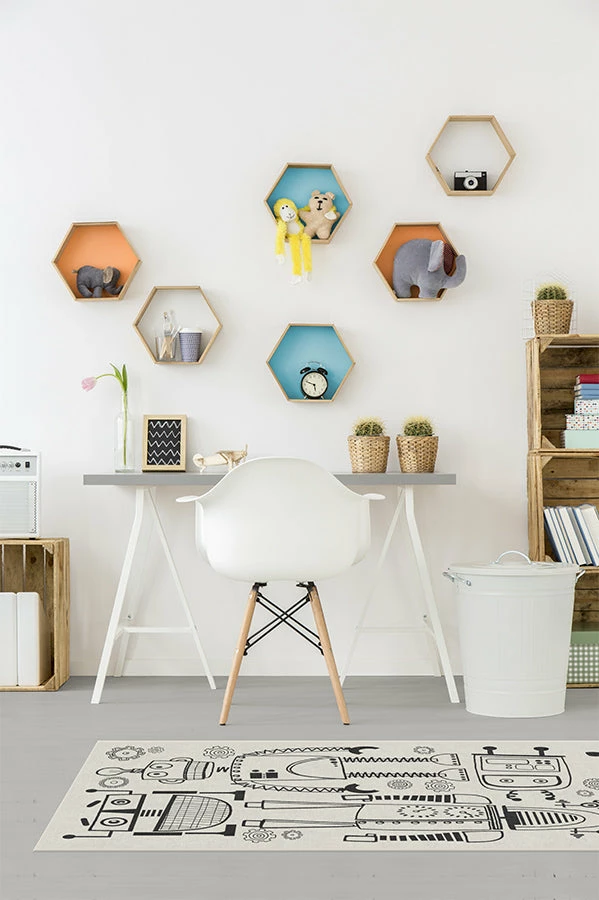 At once retro and futuristic, this Robot Party Black & White Rug has all the circuitry for fun. Designed to mimic a child’s drawing, this sci-fi-themed rug uses simple, monochromatic shapes and lines to create doodled drones and mechanical gears, making it a kid’s room must-have.