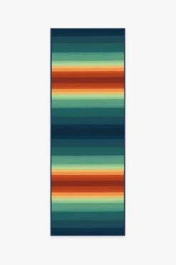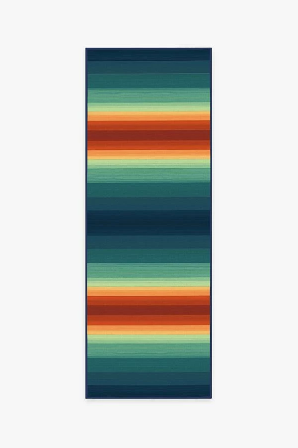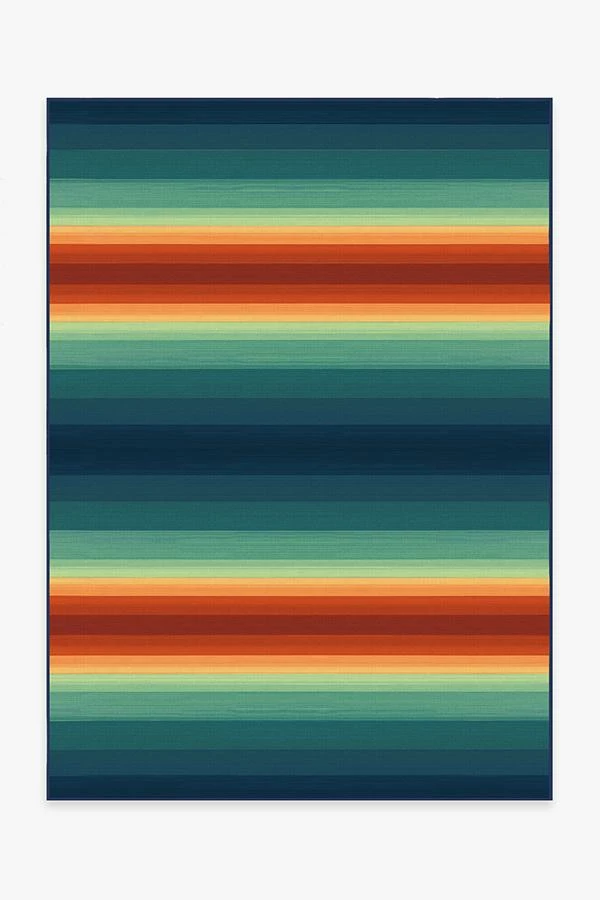 A classic pattern gets a colorful update. Our Serape Stripe Multicolor Rug has a pattern of alternating lines in a vibrant palette of poppy red, pistachio green, teal, sunburst yellow, and ocean blue with an ombre effect. The extra-durable, machine-washable material is perfect for both outdoor and indoor use, especially high-traffic areas and those exposed to the elements.