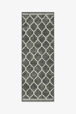 The Terali Black Rug looks to Moroccan rugs for inspiration, featuring a trellis design in neutral grey and gunmetal against a pearl background.