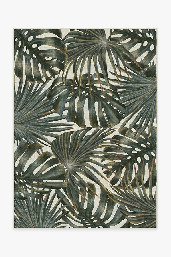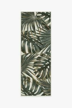 Transform your space into paradise. Our Tropical Green Rug features a lush pattern of green monstera and fan palm leaves on a cream background that will make a refreshing statement in your home. The extra-durable, machine-washable material is perfect for both outdoor and indoor use, especially high-traffic areas and those exposed to the elements.