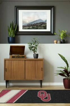 Root for the Sooners! This University of Oklahoma rug features the school logo in crimson red centered on a black background with crimson and cream accent stripes in the corner. Water-resistant, stain-resistant, and machine-washable.