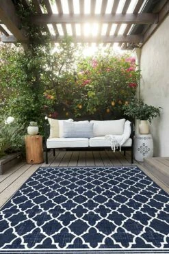 A fresh take on the classic trellis design. This outdoor rug features a repeated pattern of two different shapes, colored in off-white and set against a dark blue background. Made with an extra-durable, stain-resistant, and machine-washable material that’s perfect for your porch, patio, or deck.